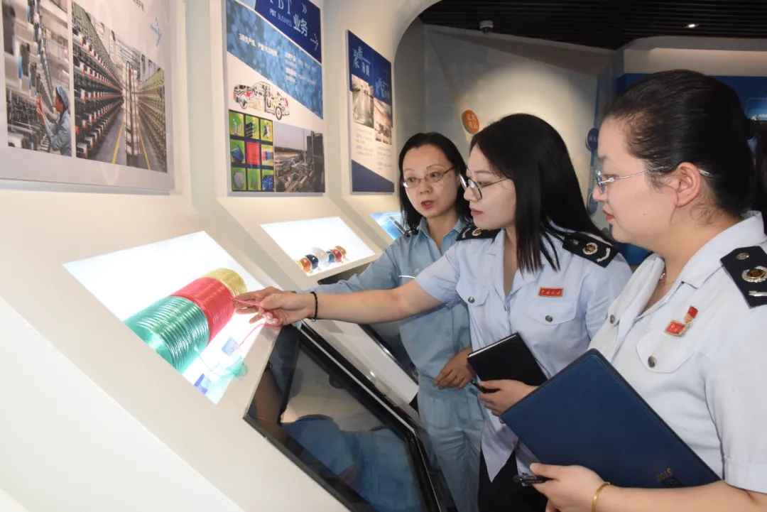 图为仪征化纤研发人员向仪征税务干部展示绿色新材料应用场景。
