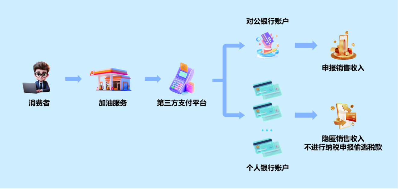 检查人员逐笔梳理第三方支付平台的交易流水,结合该加油站对公账户银行流水和申报数据,锁定与销售收入相关的资金,查实隐匿销售收入达1085.75万元。面对事实证据,该加油站负责人最终承认相关违法行为的事实:为少申报纳税,其通过使用第三方收款平台收取加油款,结算后转至个人银行账户,款项未进入对公账户申报纳税。该加油站负责人表示积极配合税务机关检查工作,如实提供相关证据资料。