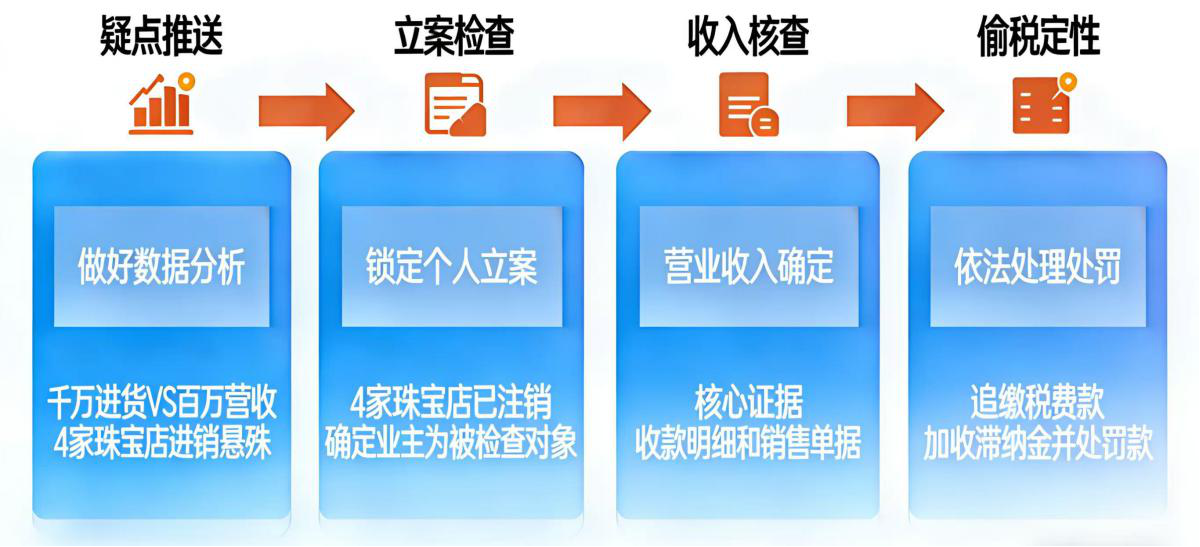 检查人员依托税收大数据分析,比对该珠宝店的发票数据和自行申报信息,发现其2022年至2024年共计接收上游两家公司金银珠宝首饰发票685份,发票金额合计8100.56万元,但同期申报的增值税应税收入仅467.35万元,消费税应税收入463.86万元。八千多万的进货成本,却只申报了不到五百万的销售收入,有违经营常理。