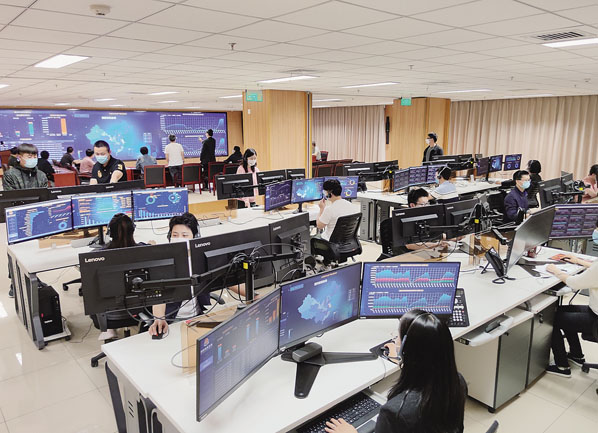 在税务总局数据中心监控指挥大厅,监控团队成员能够为各地提供准确及时的预警信息,有力保障了税收业务系统平稳运行,为“非接触式”办税缴费持续添力。