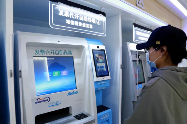 图为办税群众通过发票代开自助终端代开发票,并通过远程辅导解决涉税难题。张剑/摄