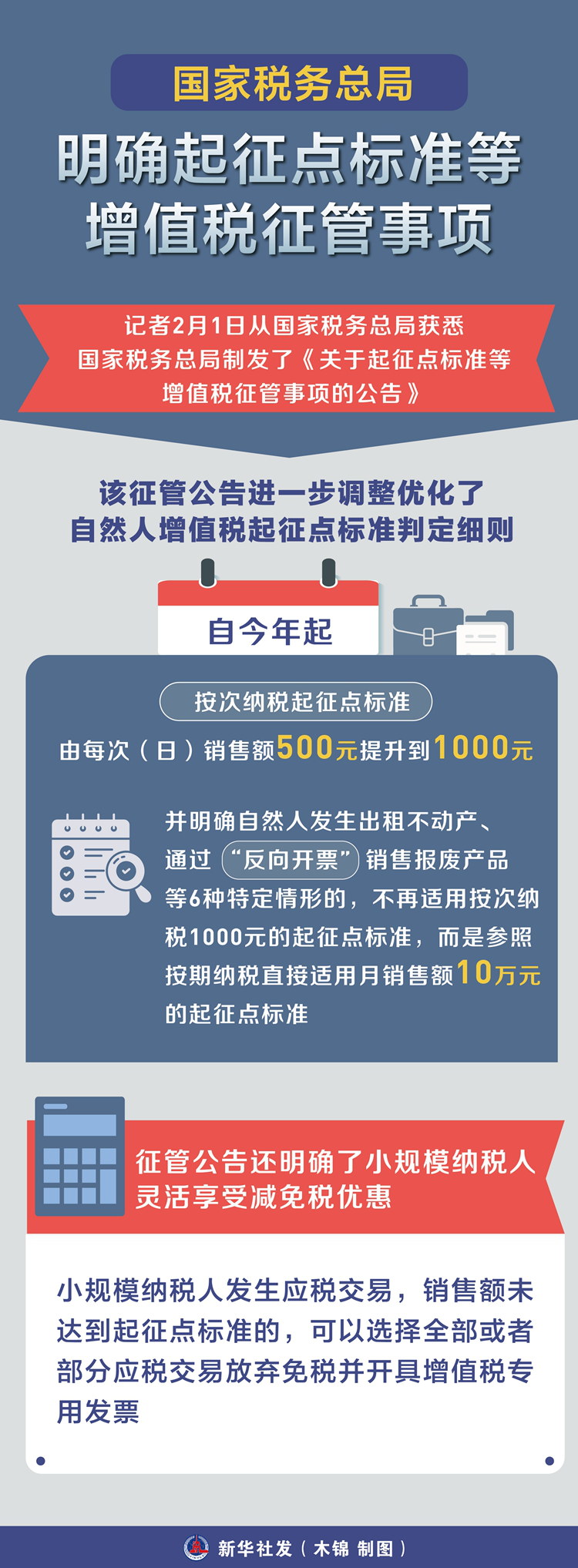 记者2月1日从国家税务总局获悉,国家税务总局制发了《关于起征点标准等增值税征管事项的公告》,就起征点标准判定、税收优惠政策适用等增值税征管事项作了进一步明确,细化操作要求,推动增值税法及其实施条例落实落地。