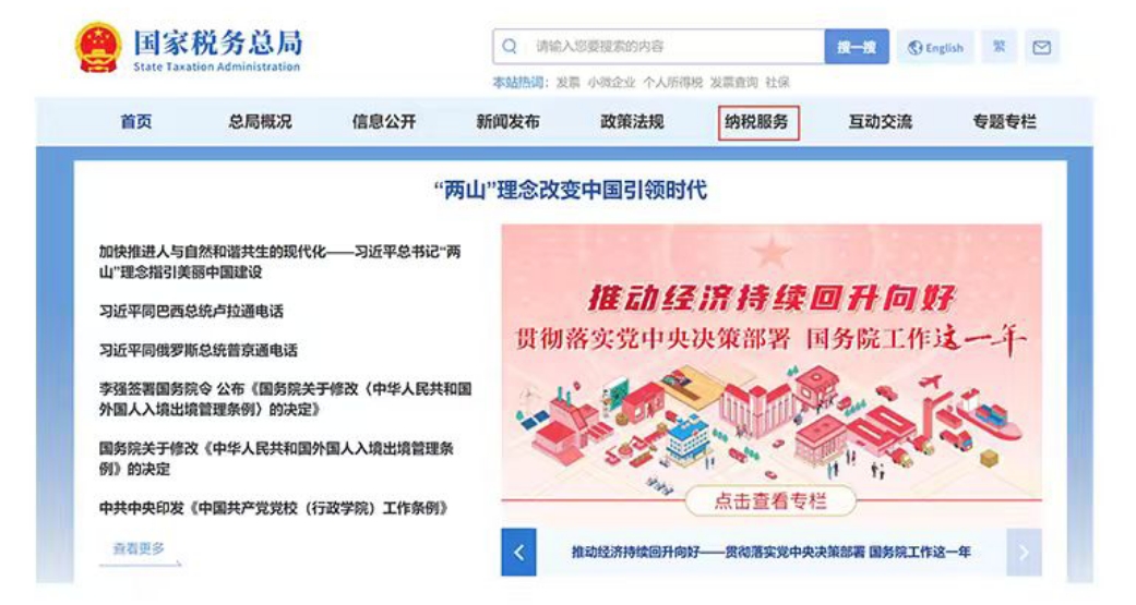1.打开“国家税务总局”网站,点击【纳税服务】栏目