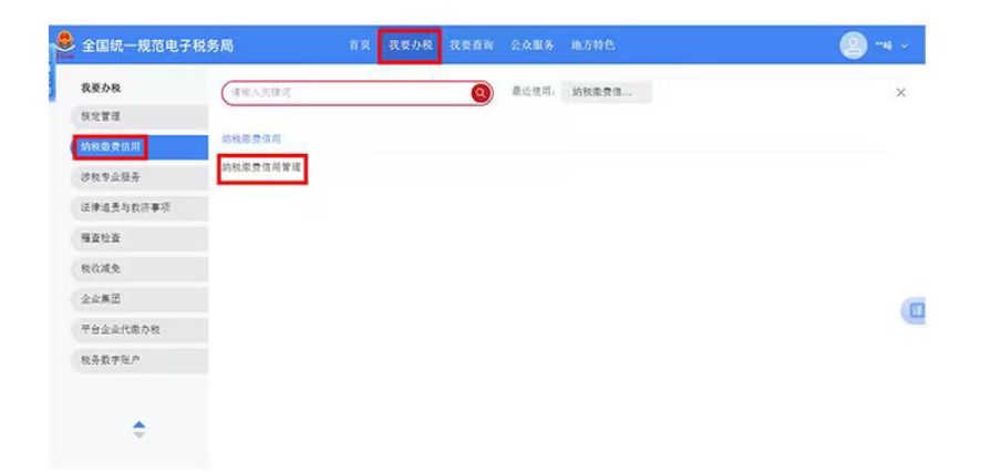 2.如需查看详细结果和指标明细,可点击【我要办税】- 【纳税缴费信用】- 【纳税缴费 信用管理】功能菜单,或直接搜索“纳税缴费信用管理”进入。