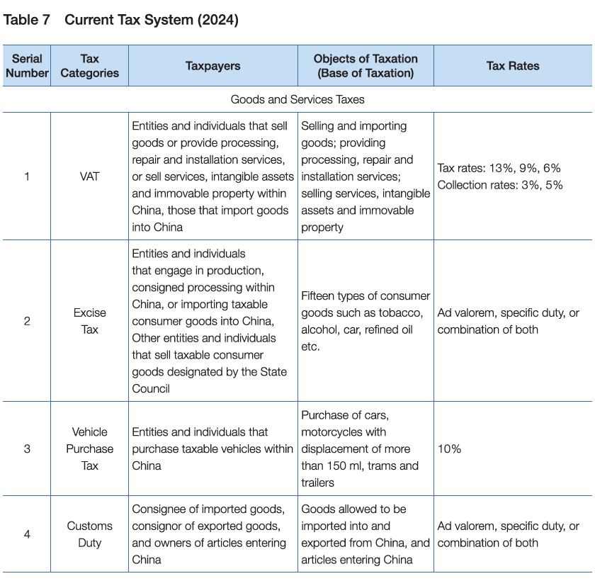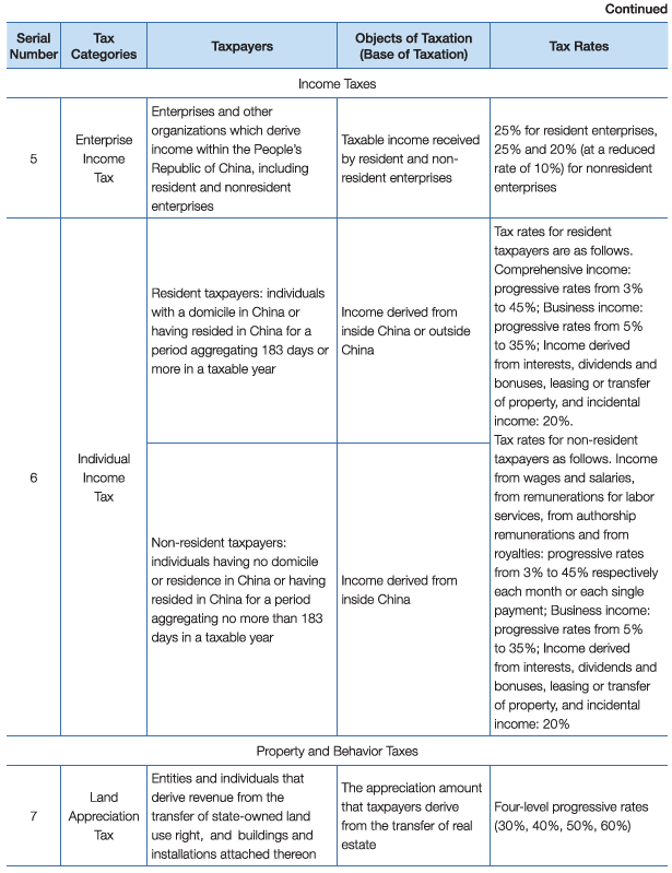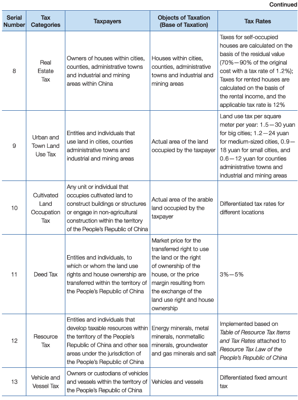 There are eighteen different kinds of taxes in China, which can be divided into three categories according to their nature. (See Table 7)