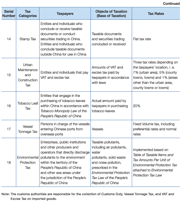 ◆ Property and behavior taxes, including Land Appreciation Tax, Real Estate Tax, Urban and Town Land Use Tax, Cultivated Land Occupation Tax, Deed Tax, Resource Tax, Vehicle and Vessel Tax, Stamp Tax, Urban Maintenance and Construction Tax, Tobacco Leaf Tax, Vessel Tonnage Tax and Environmental Protection Tax.