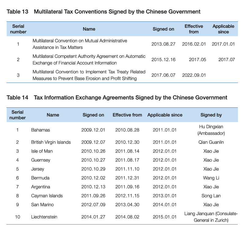 China signed the Multilateral Convention on Mutual Administrative Assistance in Tax Matters in August 2013 (See Table 13). The Convention became applicable to China on February 1, 2016 and has started to be implemented by China since January 1, 2017. China also signed Tax Information Exchange Agreements (TIEAs) with ten tax jurisdictions including Bahamas, British Virgin Islands, Isle of Man, Guernsey, Jersey, Bermuda, Argentina, Cayman Islands, San Marino and Liechtenstein, all of which have come into force and been implemented (See Table 14). China's mutual administrative assistance network has expanded to cover major trade partners and low tax jurisdictions which have frequent economic ties with China.