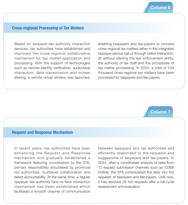 Focusing on the philosophy of "getting one thing done efficiently", the "Spring Breeze Project" was launched under the theme of "continuously enhancing efficiency, and delivering practical benefits for the public". A series of service measures benefiting both individuals and enterprises were integrated across four major categories, effectively enhancing taxpayer and fee-payer experience. In collaboration with the All-China Federation of Industry and Commerce (ACFIC), the STA conducted the 2024 "Spring Rain Nurturing Sprouts" initiative to support the development of micro and small enterprises, introducing 12 innovative service measures. The "Bank-Tax Interaction" program was further deepened, helping creditworthy micro and small enterprises secure credit loans totaling 3.06 trillion yuan in 2024. The STA continued to promote cross-regional processing of tax matters. Based on taxpayer-tax authority interactive services, are mote virtual window was established to provide cross-regional processing services for taxpayers and fee-payers. The implementation of cross-border electronic tax payment has facilitated taxpayers and fee-payers abroad to complete tax payments. With an upgraded mechanism for resolving taxpayer and fee-payer claims, the STA and provincial tax authorities leveraged coordinated efforts to resolve 1043 hot claims for taxpayers and fee-payers. Furthermore, the STA has strengthened management and services for the professional tax-related service industry, and effectively protected the legitimate rights and interests of taxpayers and fee-payers. According to a third-party survey, the taxpayer satisfaction score in 2024 reached 89.4 points which was anew high.